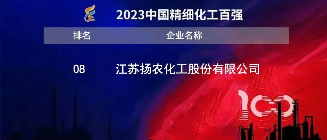 11月24日,第二十三届全国精细化工行业大会暨2023中国精细化工百强发布会上发布了“2023年度中国精细化工百强”榜单,扬农化工位列第八,较去年上升1位。会议同期还发布了2023年度中国精细化工米兰体育app官网入口-米兰(中国) 发展企业十强和创新发展企业十强榜单。