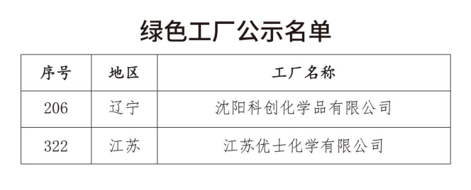 为贯彻落实《“十四五”工业绿色发展规划》《工业领域碳达峰实施方案》,持续完善绿色制造体系,助力工业领域碳达峰碳中和,近日,国家工业和信息化部发布2023年度绿色制造名单,我司旗下优士化学、沈阳科创成功入选“绿色工厂”,现已通过公示。