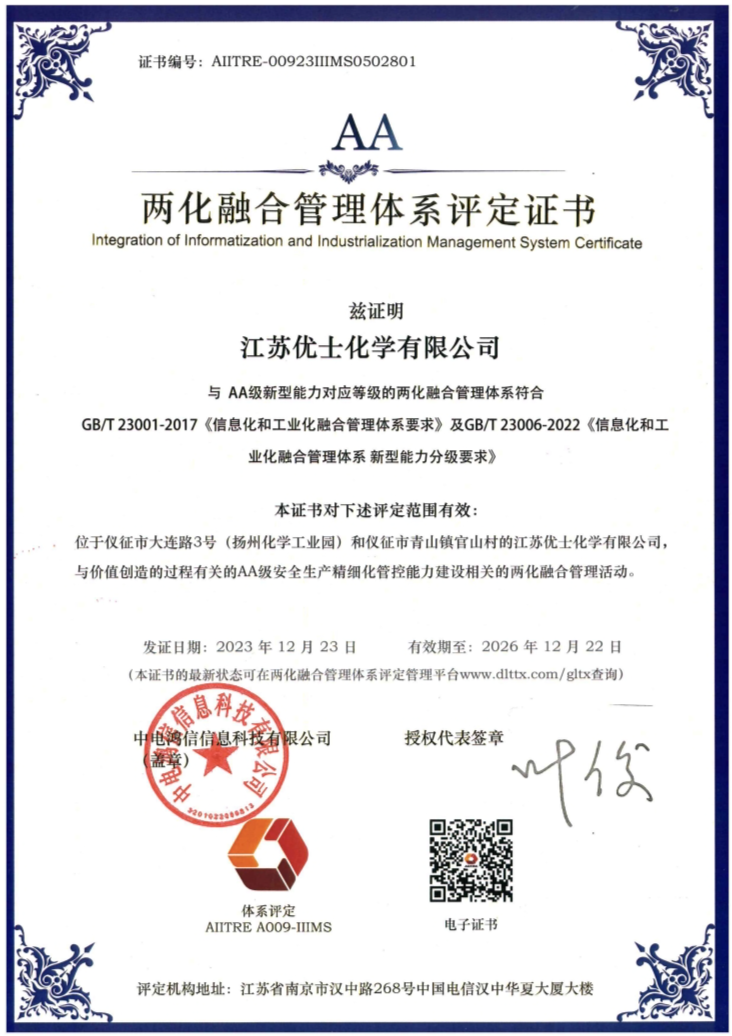 近日,子公司优士化学通过国家工业和信息化部《信息化和工业化融合管理体系要求》(GB/T 23001-2017)及《信息化和工业化融合管理体系 新型能力分级要求》(GB/T23006-2022)体系认证,正式获得“两化融合管理体系评定证书”,并取得AA级评定。