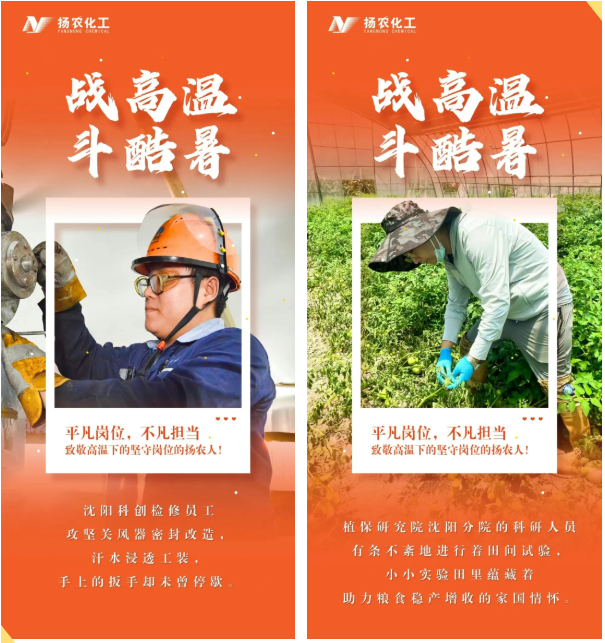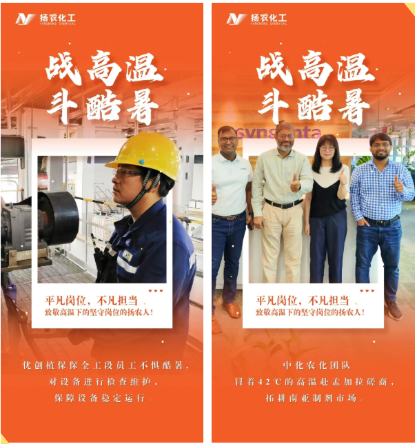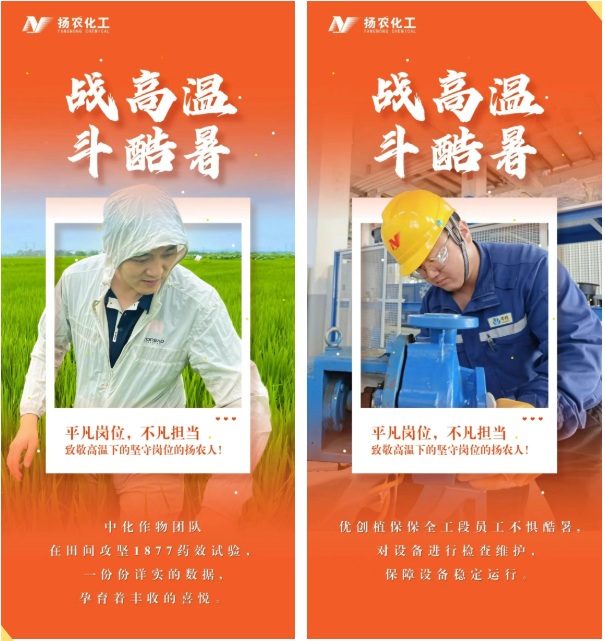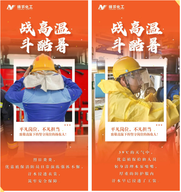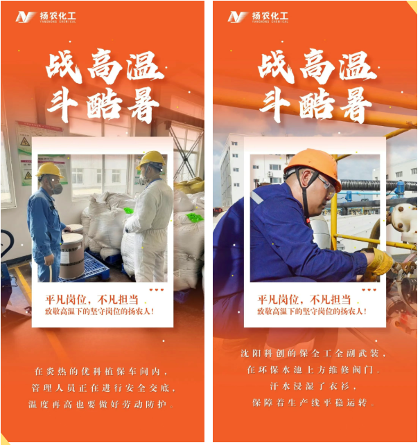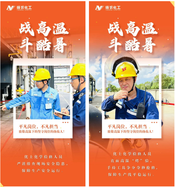 炎炎夏日,热浪如涌。在扬农股份,始终有这样一群最可爱的人——他们无惧烈日的灼烧、不畏高温的“烤”验,毅然坚守在各自的岗位上,用被汗水浸透的背影,生动诠释着艰苦创业、实干担当、守正创新、聚力共赢的扬农股份优良传统。