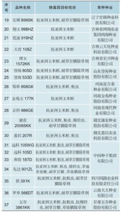 通过审定的这些品种可以合法种植了,也意味着转基因玉米、大豆商业化种植的窗口已经打开。这51个品种中有37个玉米品种,这37个品种转基因性状中单纯耐除草剂的品种有1个,单纯抗虫的品种有14个,既耐除草剂又抗虫的品种有22个,抗病的品种则是空白(详见表1和表2)。