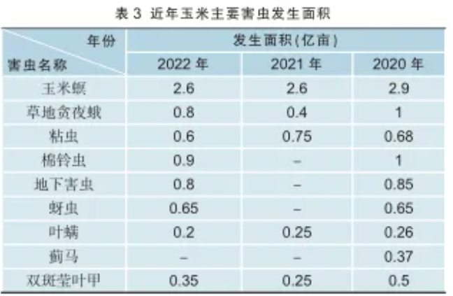 虫害是影响玉米产量和品质的重要问题。蛀穗害虫(玉米螟、桃蛀螟、棉铃虫)、粘虫和草地贪夜蛾已经成为玉米主要害虫,二点委夜蛾偶尔在个别地方暴发;地下害虫在东北西北春播玉米上危害持续加重,蚜虫、蓟马也已成为玉米苗期主要害虫;叶螨主要为害西北干旱区玉米,蚜虫则从苗期持续为害到穗期,双斑长跗萤叶甲快速上升为春玉米区的重要害虫(见表3)。