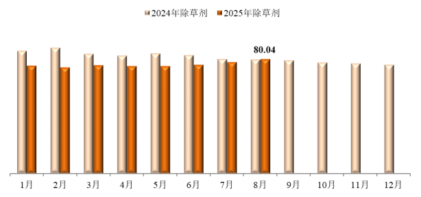 8月,除草剂价格指数为80.04,环比上涨2.57%,同比上涨0.09%。监测在内的44种除草剂产品中,加权平均成交价格环比上涨的26种,环比持平的2种,环比下跌的16种;加权平均成交价格同比上涨的16种,同比下跌的28种。